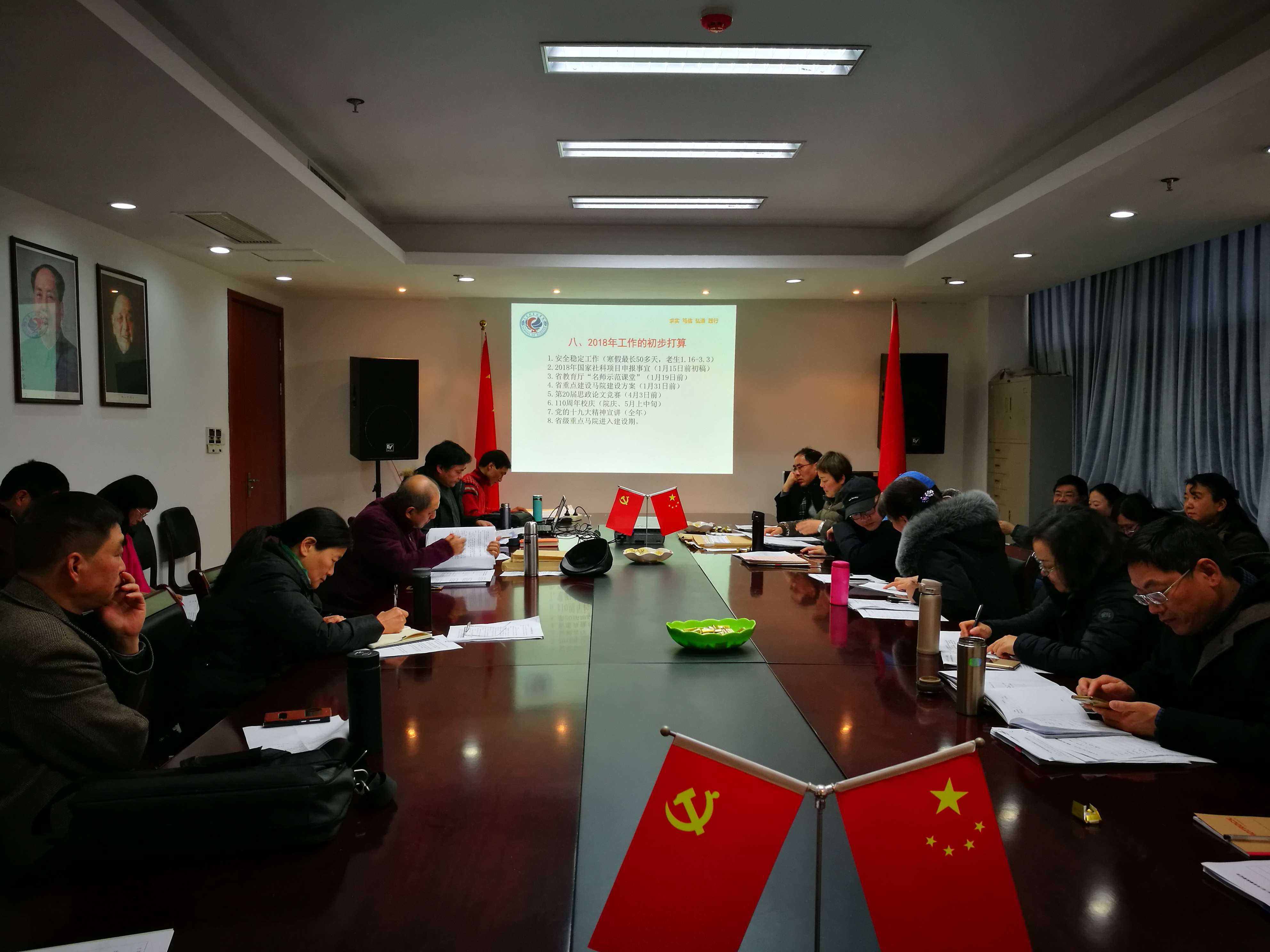 最后,院长余龙进对学院2017年在党建、教学、科研与地方服务、师资队伍建设、学科建设及综合管理等方面取得的成绩、存在的问题以及2018年的工作计划进行了总结与阐述。在总结中,余龙进对比学院“十三五”规划指标及学校2017年各类专项目标任务进行解读,他说:2017年日本色情片 在学校党委行政的正确领导下和全院教职工的共同努力下,取得了一定成绩,特别是入选省级重点马院建设单位是对我院前期工作的充分肯定,也是对我院今后工作的激励与鞭策;2018年是重点马院建设的开局之年,全院师生应在过去工作成绩的基础上,总结经验,翻篇归零,重新起航,未来要加强与全国高校重点日本色情片 和省内外同行的学习与交流,形成自己的特色,增强服务地方经济社会发展的能力与水平,为打造国内具有一定影响力的特色鲜明的日本色情片 而努力。