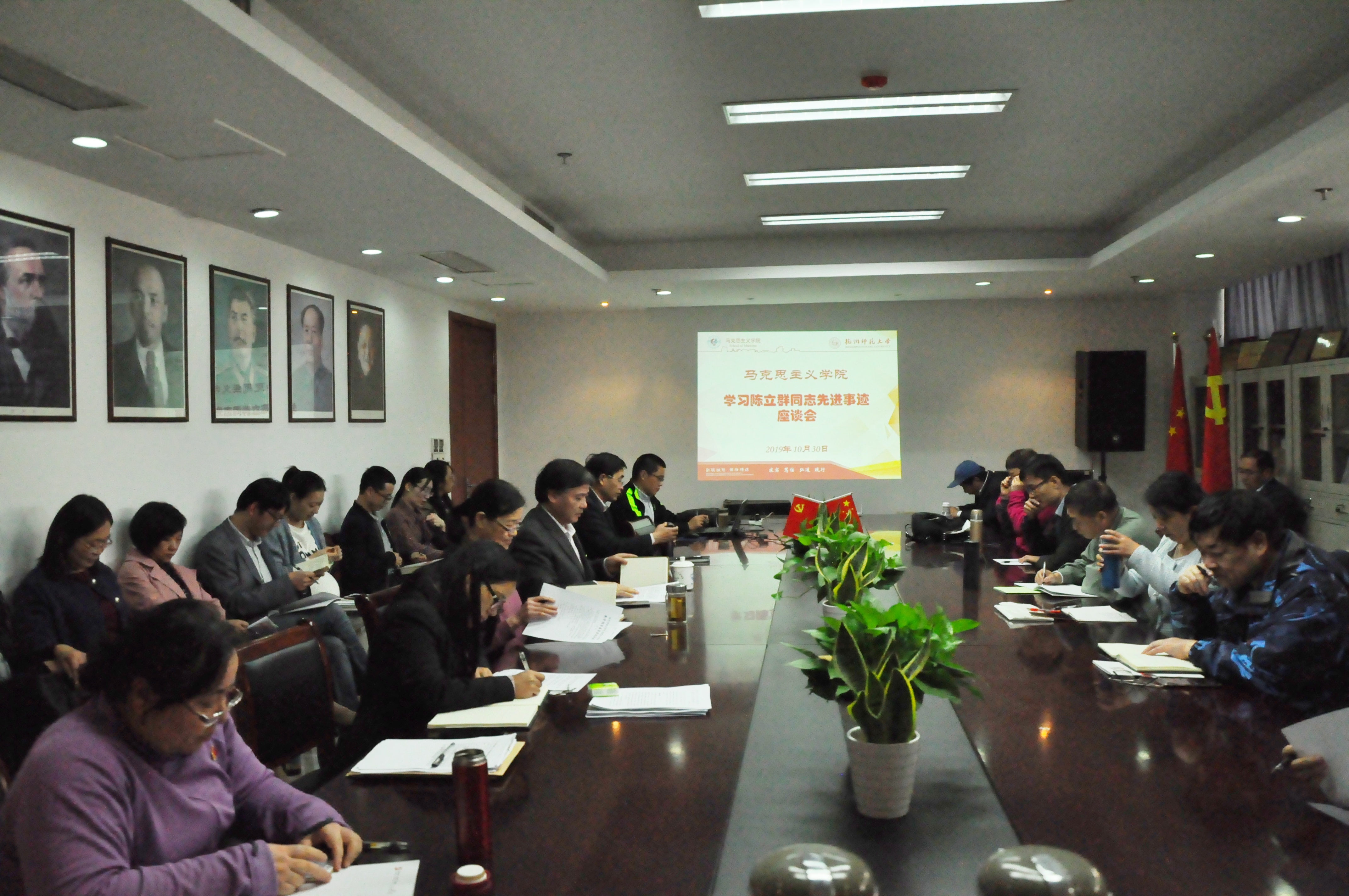 10月30日下午,在恕园1号楼306会议室,日本色情片 党总支组织召开全体教职工学习陈立群同志先进事迹座谈会。学院党总支书记、院长余龙进主持并讲话,副院长何丽君和全体教职工参加,研究生党支部书记方勇骏博士作主旨发言。
