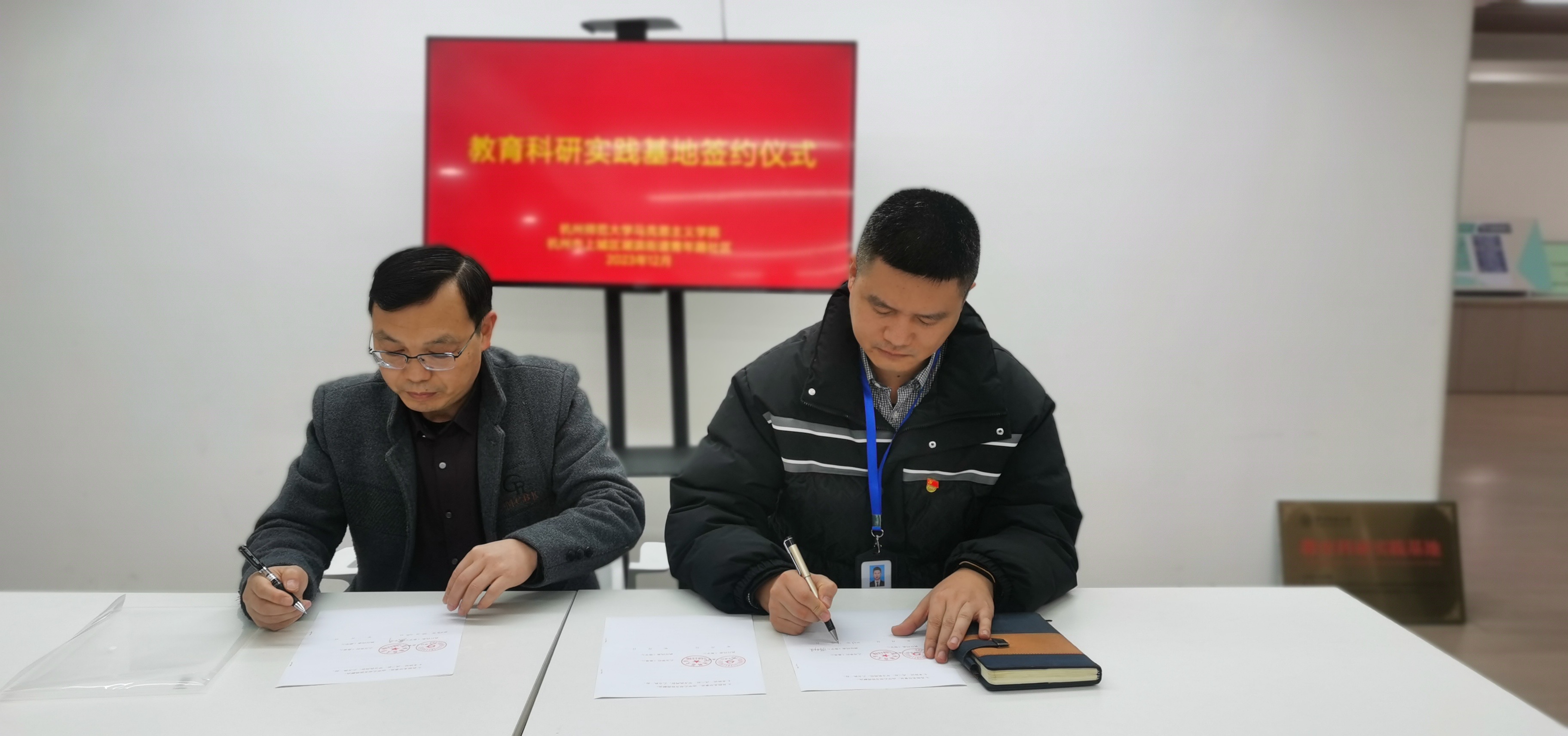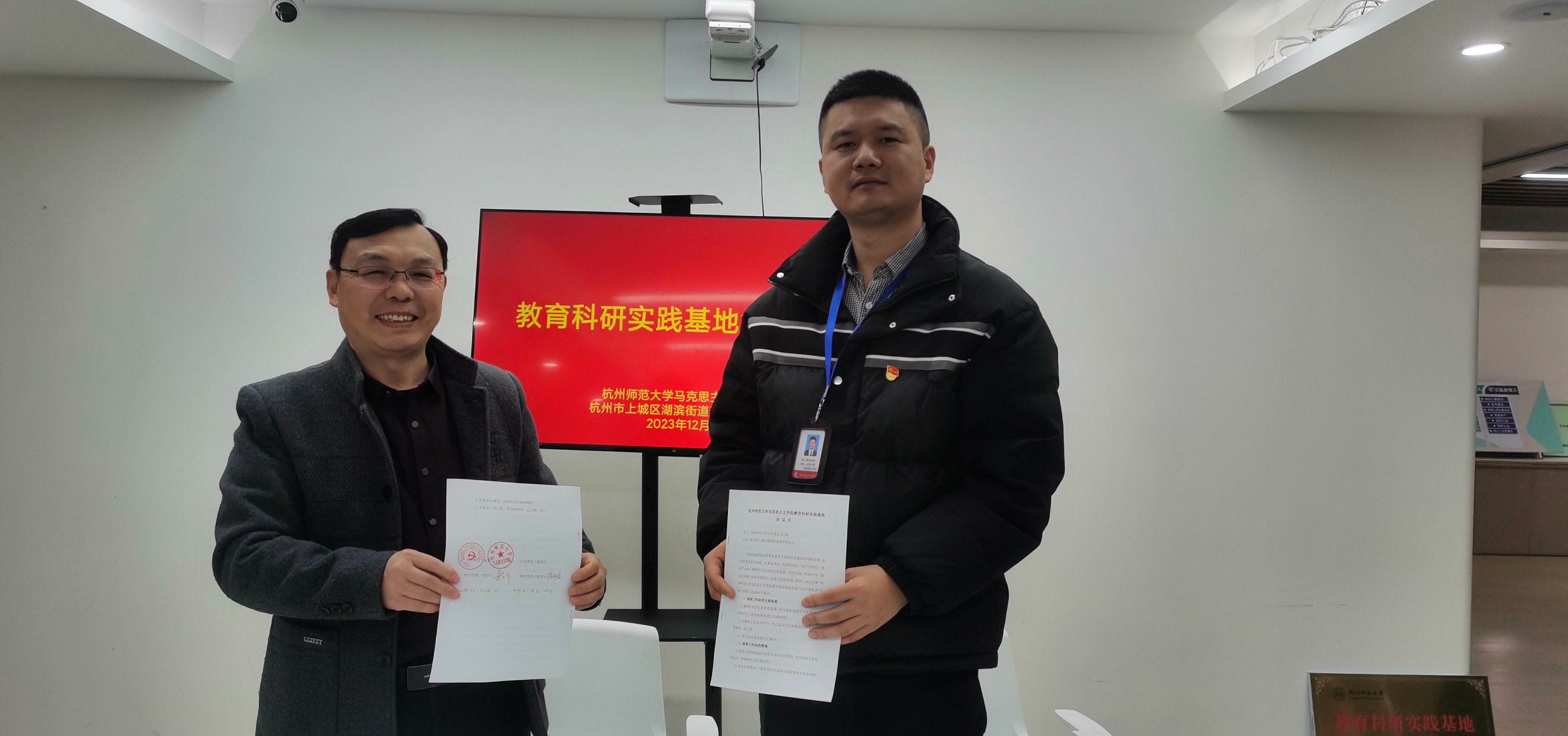 12月12日下午,日本色情片 与上城区湖滨街道青年路社区举行党建联建、教育科研实践基地签约及授牌仪式。日本色情片 副院长龚上华、青年路社区党委书记蒋剑俊代表双方进行了签约授牌。