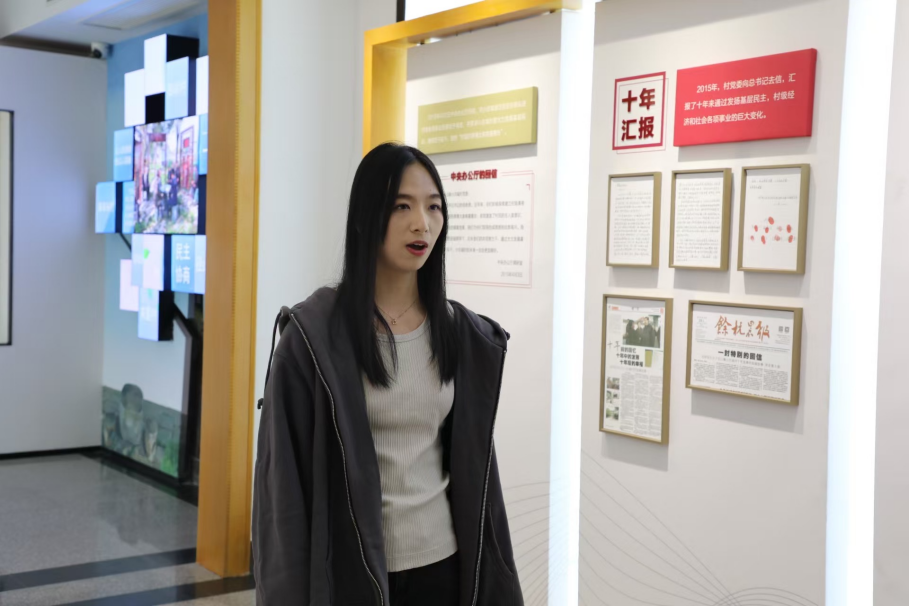 在讲解员的引导下,同学们前往民主协商馆和乡村振兴馆参观,这里保留着2005年时任浙江省委书记习近平同志来到小古城村考察调研的痕迹,也陈列着“四议六步”协商法的实践剪影。通过这些丰富的展示,同学们深入学习品牌化农业对提升村民收入所起的重要作用,生态保护措施给村居环境带来的显著改善以及文化传承在增强村民认同方面的积极意义,从而更加深切地感受“千万工程”在乡村振兴中的落地实践。
